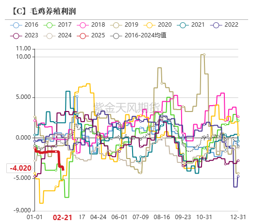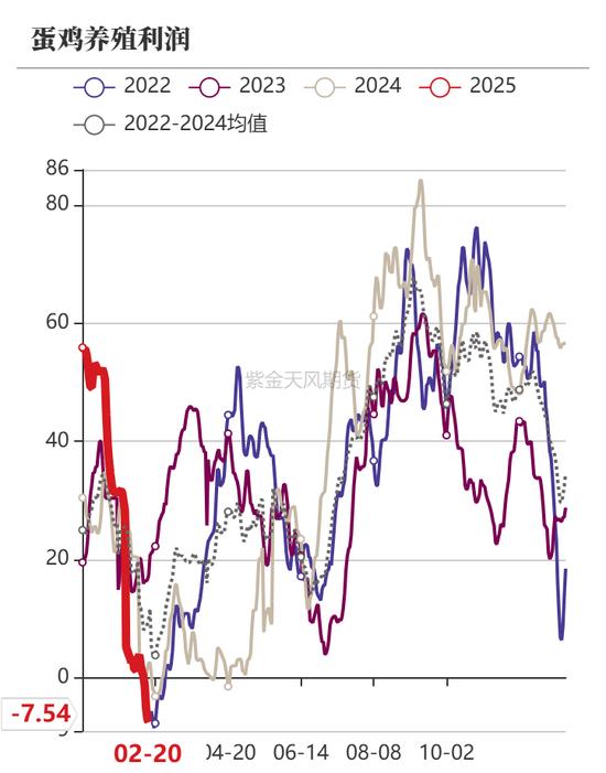 截止2月21日当周,毛鸡周度养殖利润-4.02元/只,较节前-0.49元/只。蛋鸡周度养殖利润为-7.54元/只,较上周下降10.21元/只。