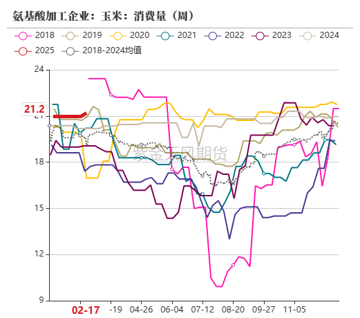 截止2月21日当周,96家深加工企业玉米库存量489.4 万吨,较上周上涨9.82%。