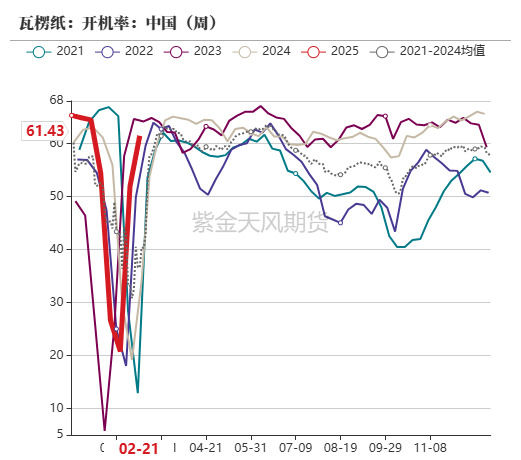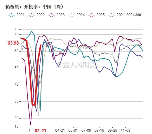 截止2月21日当周,F55果葡糖浆开机率在39.99%,开工较上周增加13.75个百分点,整体来看,果葡糖浆近期仍在恢复生产,开工增加;麦芽糖浆开工率为39.34%,环比上周增加18.05个百分点,企业开工仍在恢复,整体开工增加;瓦楞纸开工率61.43%,环比上周升高9.53%;箱板纸开工率63.98%,环比上周升高9.79%。