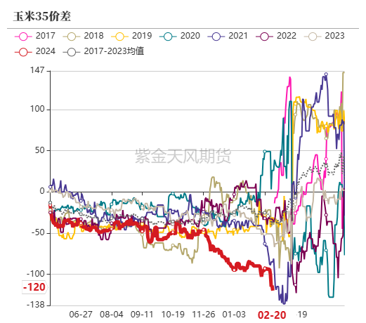 由于3月仍处年后卖压集中释放阶段,供应仍旧较为集中,加上气温逐渐回升,粮源存在霉变风险,故出粮较为集中,价格承压,故2503贴水2505;9月是传统玉米青黄不接时期,供需压力较小,且需求处于转好的关键点,故价格表现相较5月较为强势,故2505贴水2509。预计后期近月月差在接近前高位置或仍会遇阻下行。