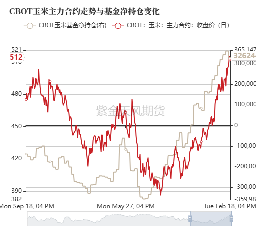 截止2月21日当周,净多持仓为32.62万手,环比上周减少3.53万手,做多意愿有所减弱。当周CBOT玉米主力合约价格最低价504.25美分/蒲式耳,最高价518.75美分/蒲式耳。