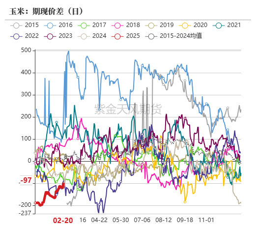 截止2月21日当周,玉米期货价差结构为2503贴水2505,2505贴水2509。
