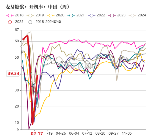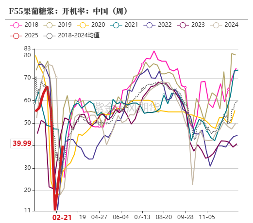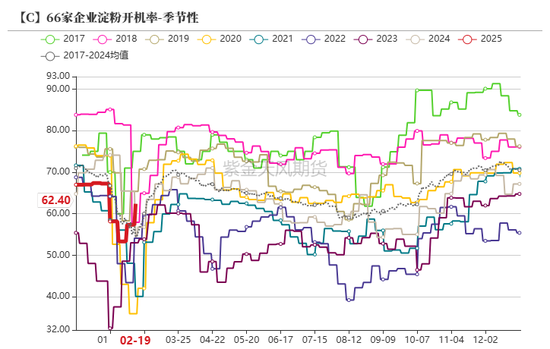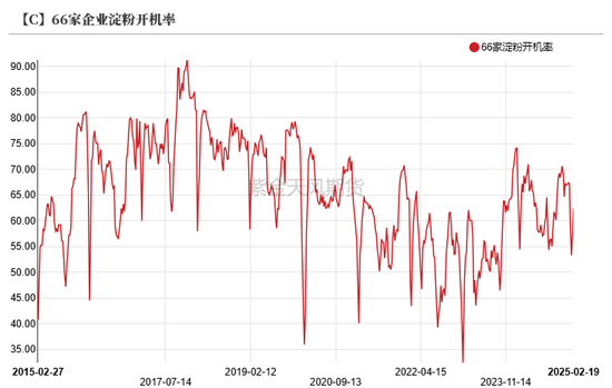 截止2月21日当周,企业淀粉开机率为62.4%,环比升高5.05%。
