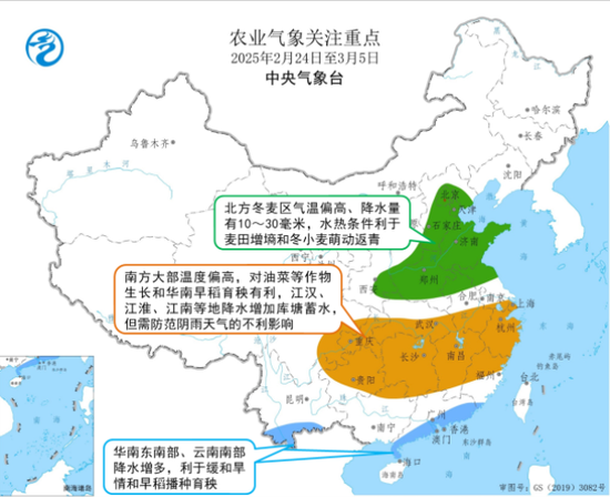 截止2月21日当周,新疆北疆中部、西北地区中部、内蒙古东部、东北地区大部、华北北部等地气温较常年同期偏低1-4℃,全国其余大部地区气温接近常年或略偏高。江淮西南部、江汉南部、江南大部、华南西部和北部、西南地区东南部等地降水量为10-50毫米。整体来看,北方冬麦区大部光热条件良好,土壤墒情适宜,气象条件总体利于冬小麦越冬返青和设施农业生产,利于春节后玉米运输购销。