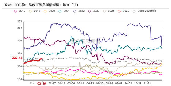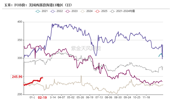 2月21日当周,美国2024/2025年度玉米出口装船160.6万吨,前一周为135.4万吨;美国对中国(大陆地区)装船玉米0.4万吨,上一周对中国装船为0万吨,环比增加0.4万吨,累计对中国销售量3.2万吨。