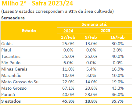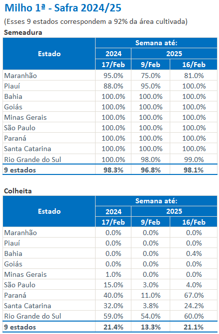 核心观点:中性 乌克兰农业部称,截至2月19日,2024/25年度(始于7月)乌克兰谷物出口量为2799.8万吨,比去年同期的2705.9增长94万吨或3.5%。其中玉米出口量为1378.4万吨。上周巴西玉米主产区气温距平值较往年变化不大,中东部地区降水较往年偏少,南部地区降水偏多;NOAA预计,巴西玉米主产州未来6-10日气温依旧偏高,巴西南里奥格兰德州降水偏多,巴西中南部玉米主产州马托格罗索州、帕拉纳州降水偏多。巴西一茬玉米播种进度98.1%,略慢于去年,收获进度21.1%,略慢于去年。二茬玉米播种进度35.7%,慢于去年。