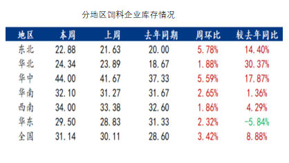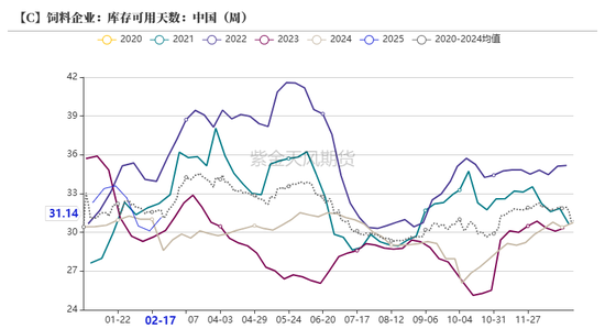 截止2月21日当周,样本饲料企业玉米平均存31.14天,较上周增加1.03 天,环比上涨3.42%,同比上涨8.88%。