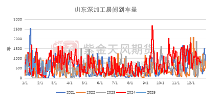 截止2月21日当周,山东深加工到车量累计3151辆,环比上周1671辆,增加1480辆,增幅88.56%。