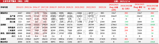 截至2月21日,玉米平衡表与上月调整不大,依旧维持新作产量下调预期,下降幅度约为760万吨左右,另外随着进口玉米政策收紧,预估新季玉米进口量将有300万吨的下调,总体供需维持紧平衡状态,期末库存相比去年有明显减少但依旧维持宽松预期。
