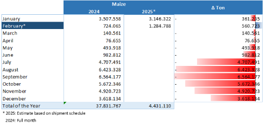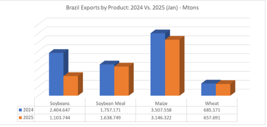 截止当周,巴西玉米2025年1月累计出口314.63万吨,相比去年1月出口350.75万吨,减少36.12万吨,降幅10.29%。